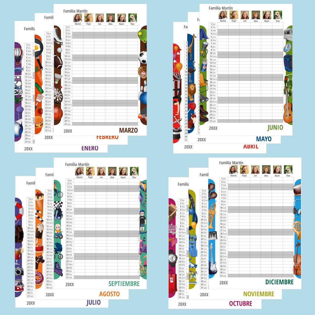 Es personalizable con el nombre de tu familia así como con los nombres de cada unos de sus miembros. ¡No olvidéis añadir a vuestra mascota! Gracias a las columnas personalizadas podrás anotar cada día en la casilla correspondiente todo aquello que no podéis olvidar. Anótalo todo y no se te pasará ninguna otra cita importante.
